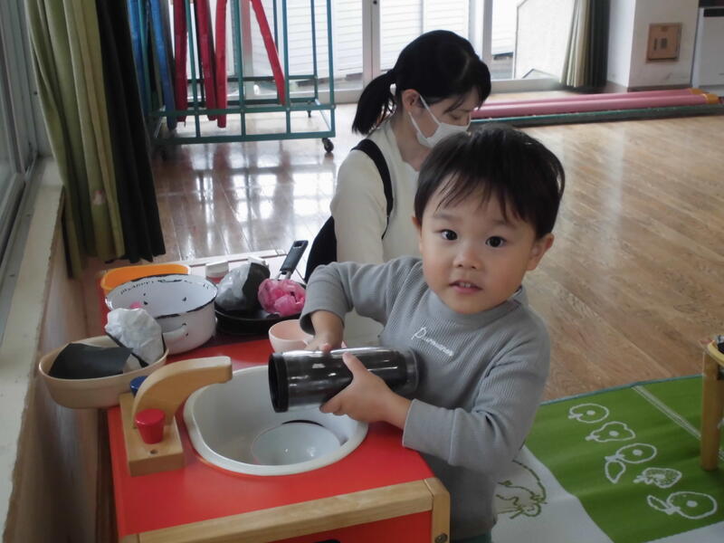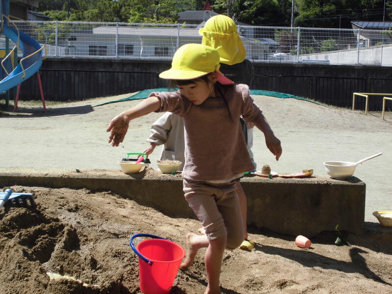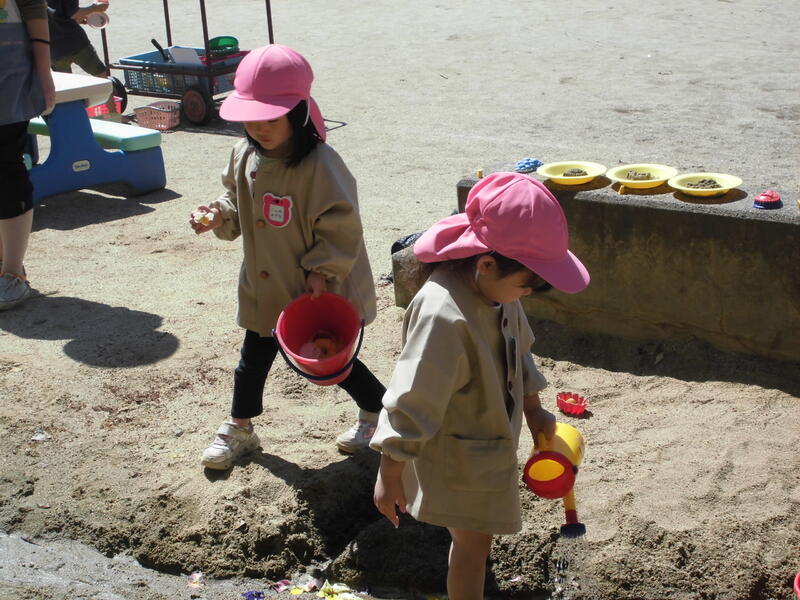 年少さん、年長さんともに園庭の砂場で水を流したり、お団子を作ったりと思い思いの遊びをしていました。