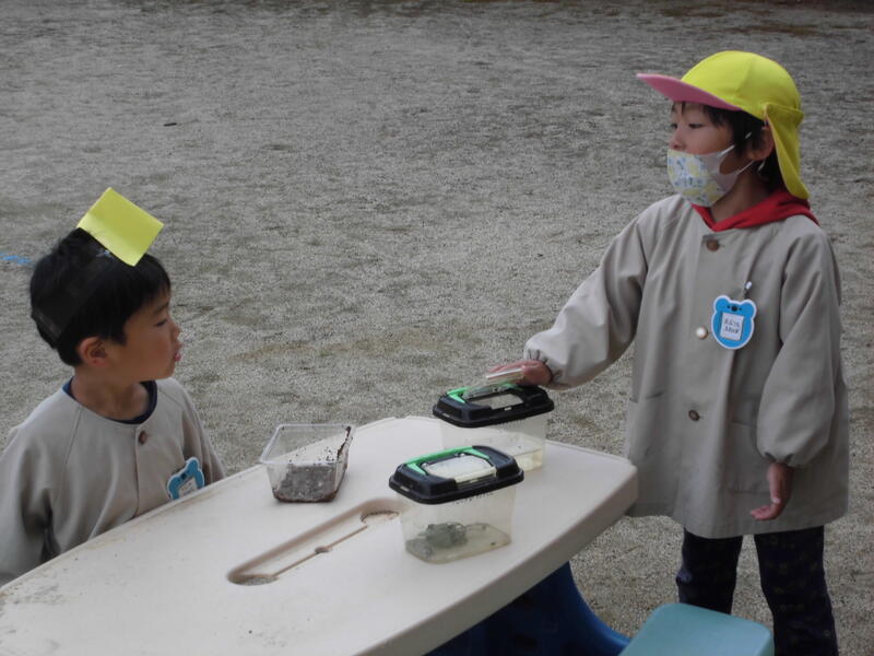 石の下やマットの下からダンゴムシやハサミムシを採集しました。動き回る虫たちを虫かごや容器に入れるのに苦労していましたが、それぞれの虫たちの動きを興味深く観察しました。