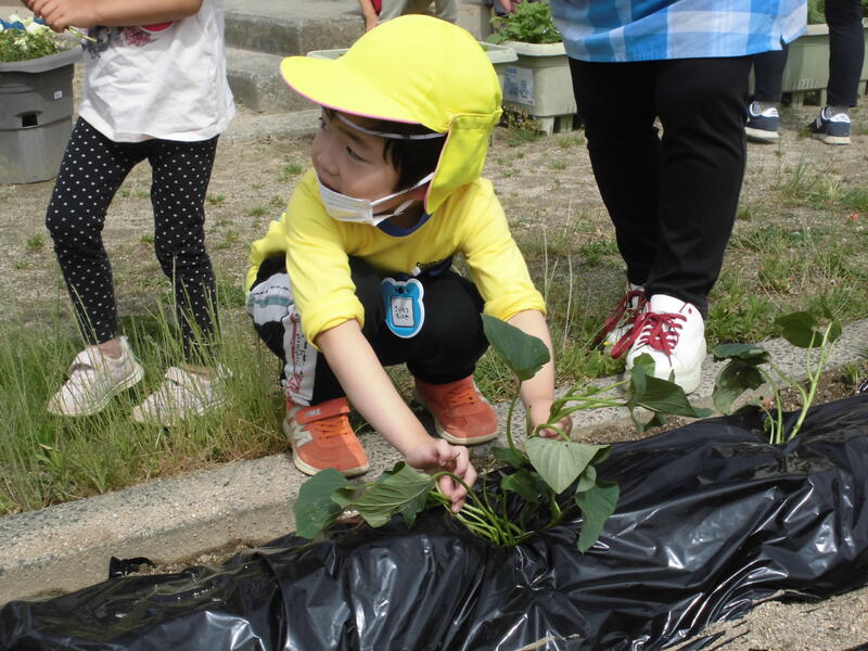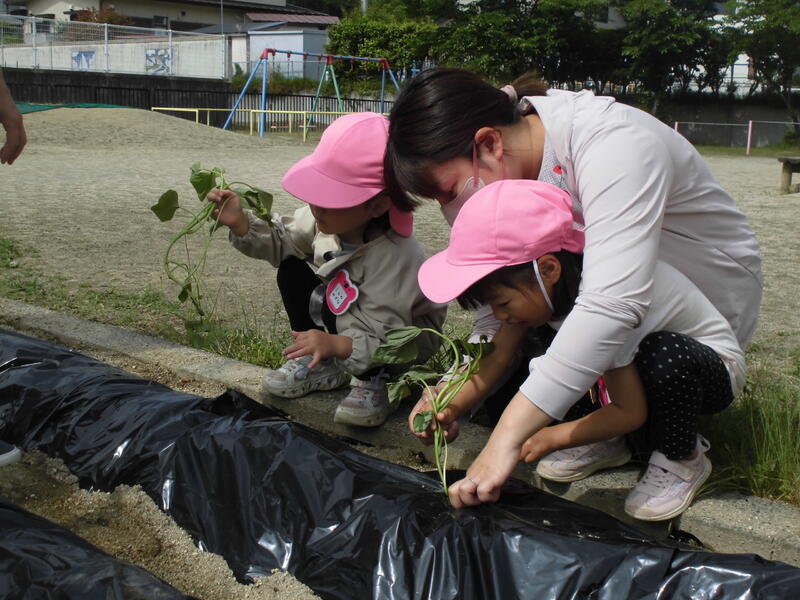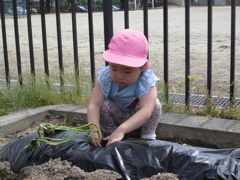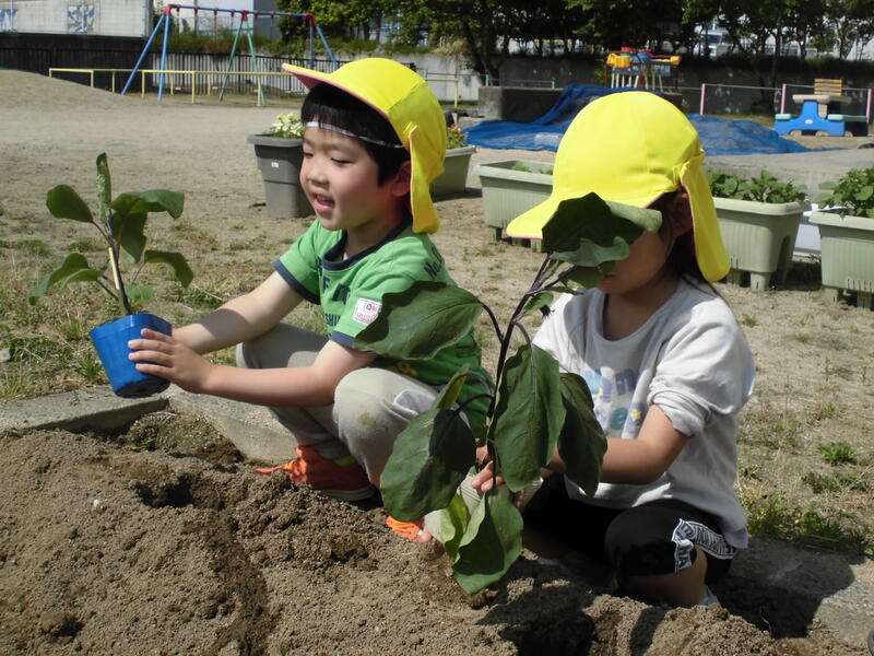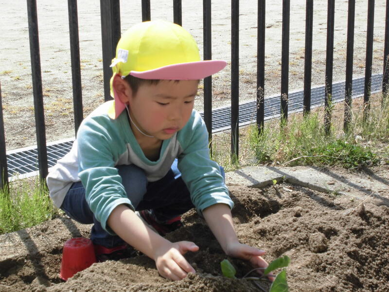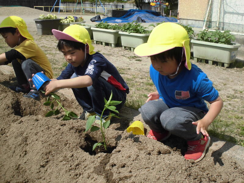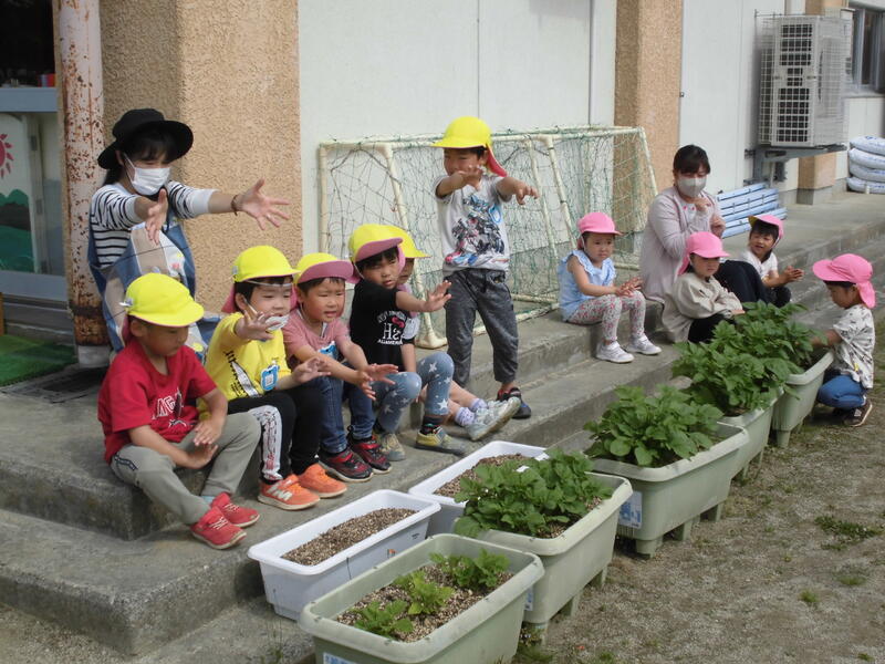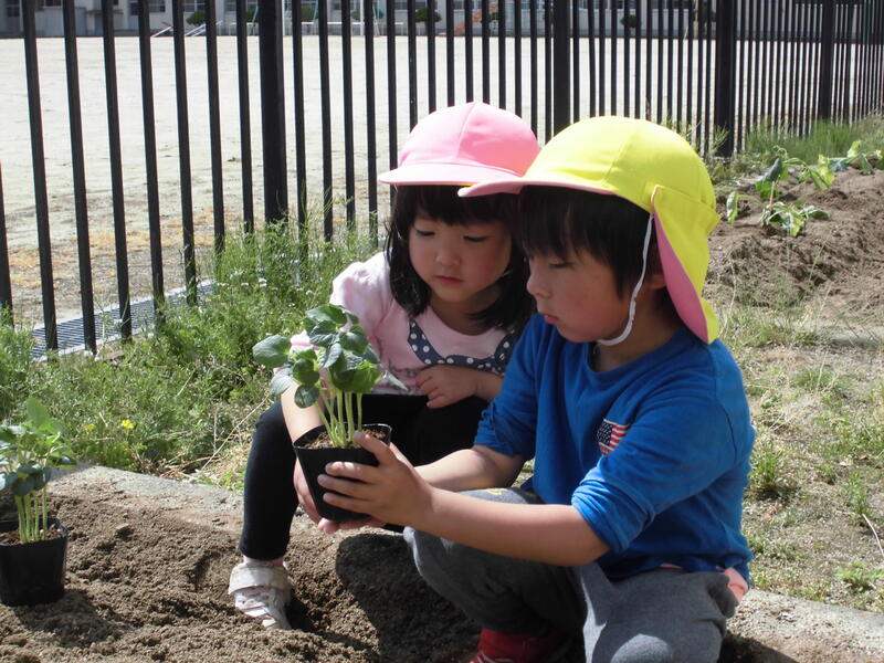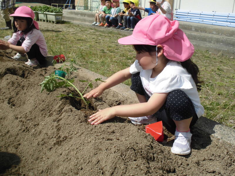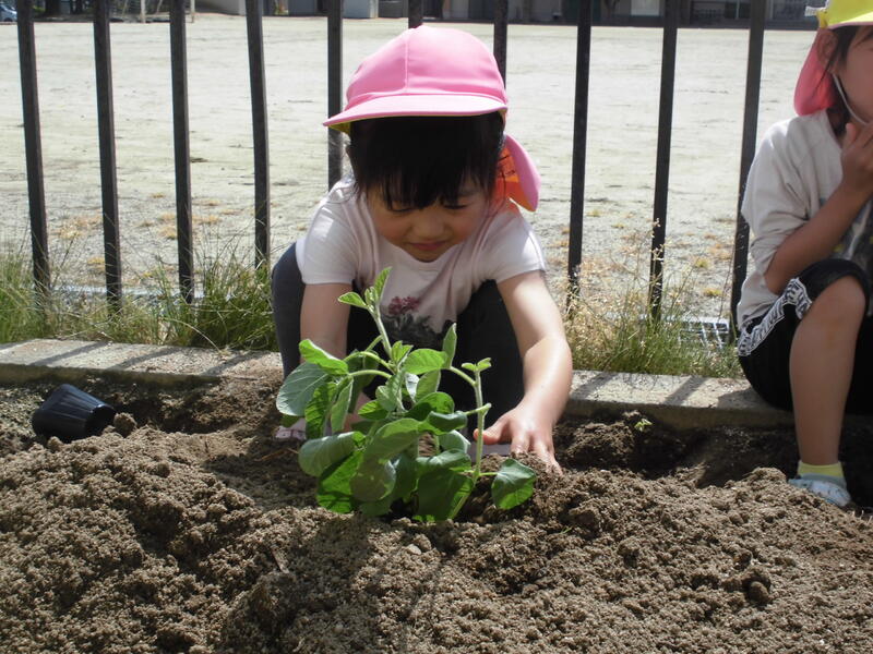 今日は園児全員で野菜の苗を植えました。どんな野菜の苗なのか、また、どのように植えるのかのお話を聞いた後一人ひとりが丁寧に植えました。なかよしペアで水やりもしました。最後に野菜が立派に成長するように全員で「大きくなーれ」とパワーを送りました。
