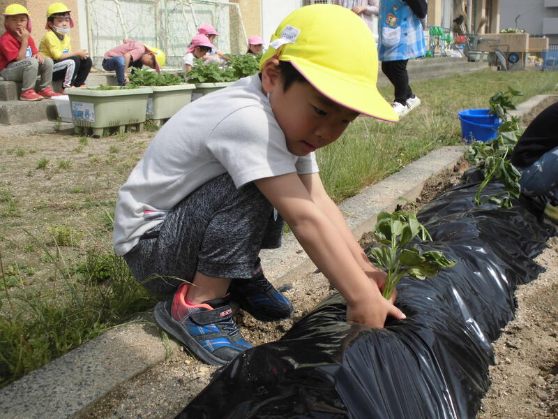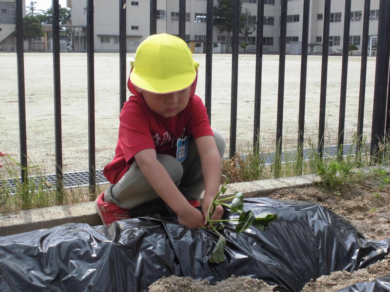 先生から苗の植え方を聞いてそれぞれ実践。マルチをかけていたのでちょっと苦戦しながらもしっかり植えることができました。最後に、全員で「早く大きくなれー。おいしくなれー」とパワーを送りました。収穫が楽しみです。