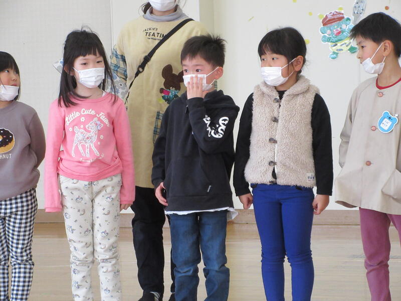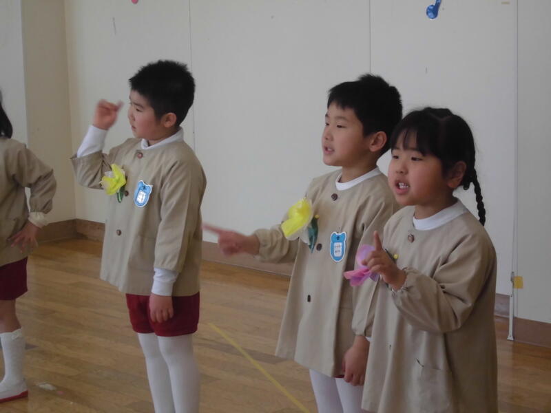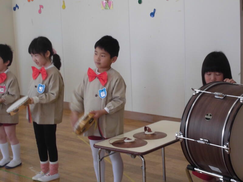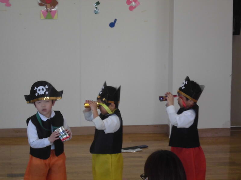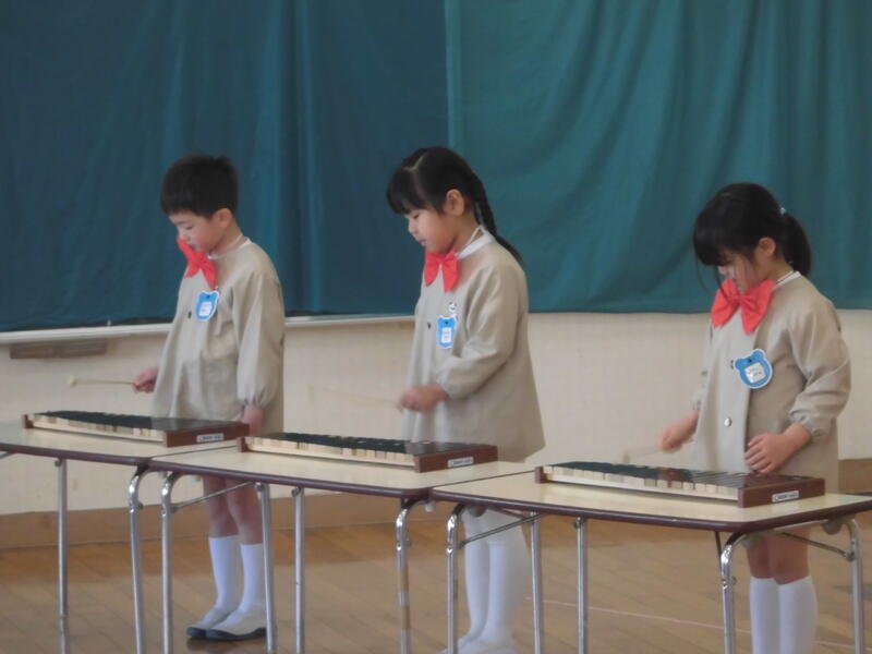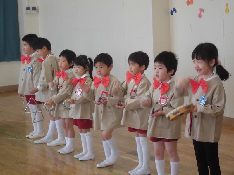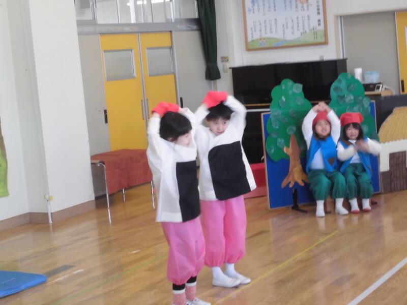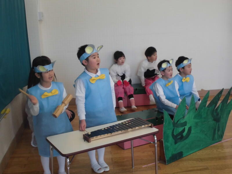 1 はじめの言葉  うさぎ組さんが元気に「はじめの言葉」を言いました。2 全員合奏「勇気100%」3 年少組 「ぼくらはちいさなかいぞくだ」4 年長組 「これがにほんのおまつりさ」5 年少組 歌「すうじのうた」「そうだったらいいのにな」6 年長組 歌「ドキドキドン 1年生」「ありがとうの花」7 年少組 「すきなこと」8 年長組 「得意技」9 年少組 劇「もりのおふとん」10 年長組 劇「おむすびころりん」 たくさんの演目がありましたが、それぞれの園児が自分の役割をしっかり果たし、みんな満足そうでした。来園いただいた保護者の皆様ありがとうございました。