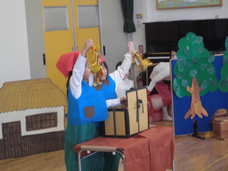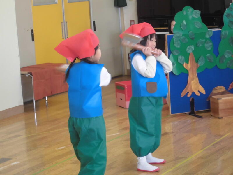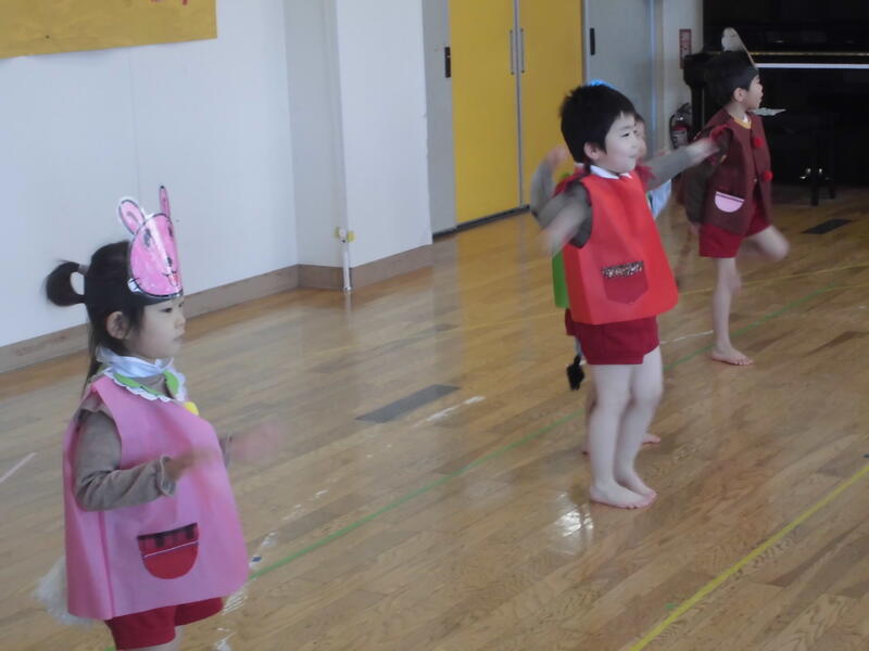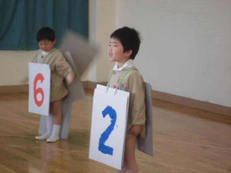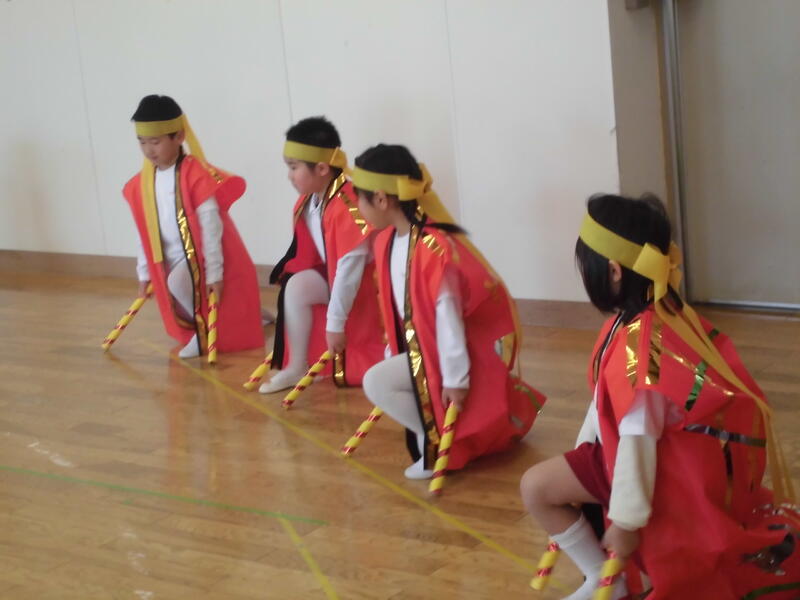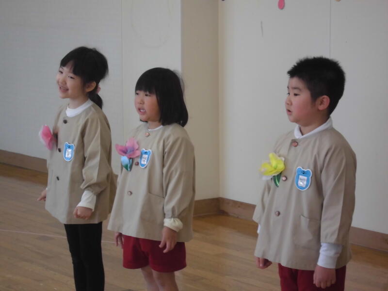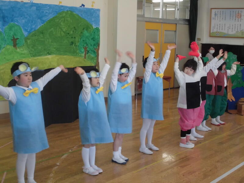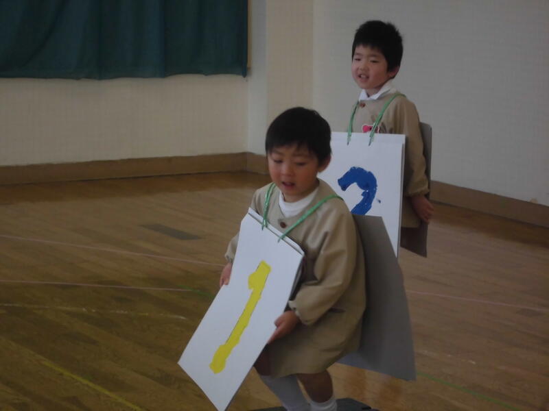 1 はじめの言葉  うさぎ組さんが元気に「はじめの言葉」を言いました。2 全員合奏「勇気100%」3 年少組 「ぼくらはちいさなかいぞくだ」4 年長組 「これがにほんのおまつりさ」5 年少組 歌「すうじのうた」「そうだったらいいのにな」6 年長組 歌「ドキドキドン 1年生」「ありがとうの花」7 年少組 「すきなこと」8 年長組 「得意技」9 年少組 劇「もりのおふとん」10 年長組 劇「おむすびころりん」 たくさんの演目がありましたが、それぞれの園児が自分の役割をしっかり果たし、みんな満足そうでした。来園いただいた保護者の皆様ありがとうございました。