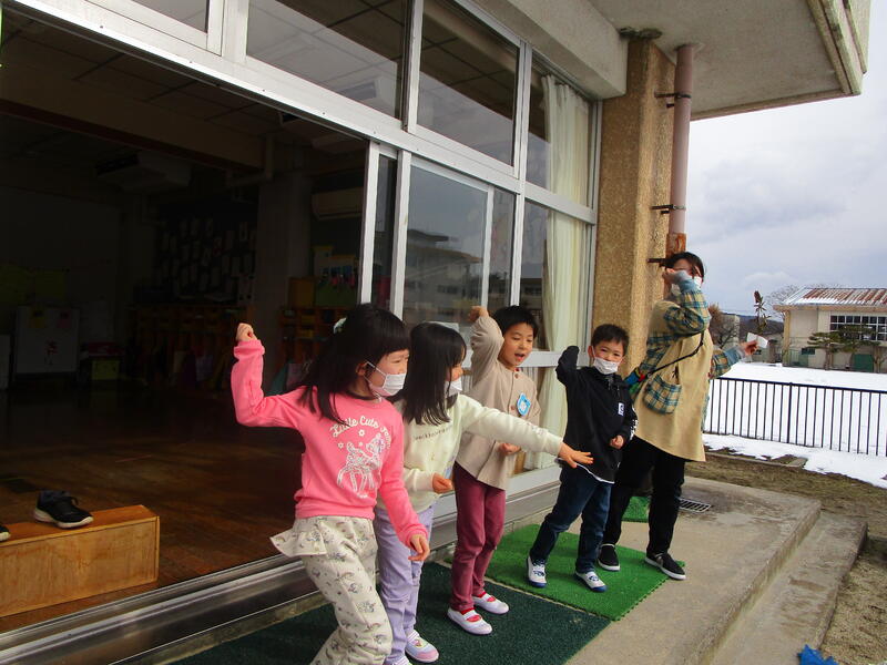 屋外で「鬼は外、福は内」と元気な掛け声で豆まきをした後、年少さん、年長さんそれぞれが鬼に扮して豆まきをしました。最後に年の数より1つ多くの豆を分けてもらい、おいしくいただきました。今年1年健康で元気に生活できますように。
