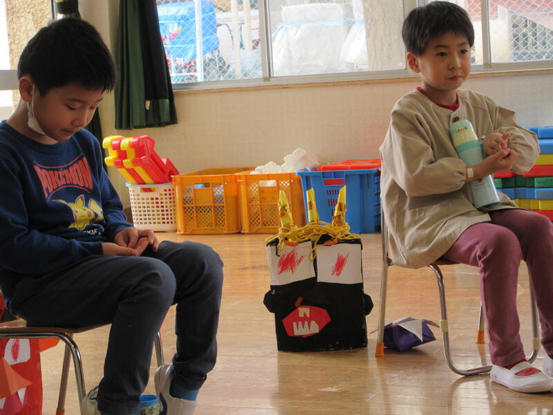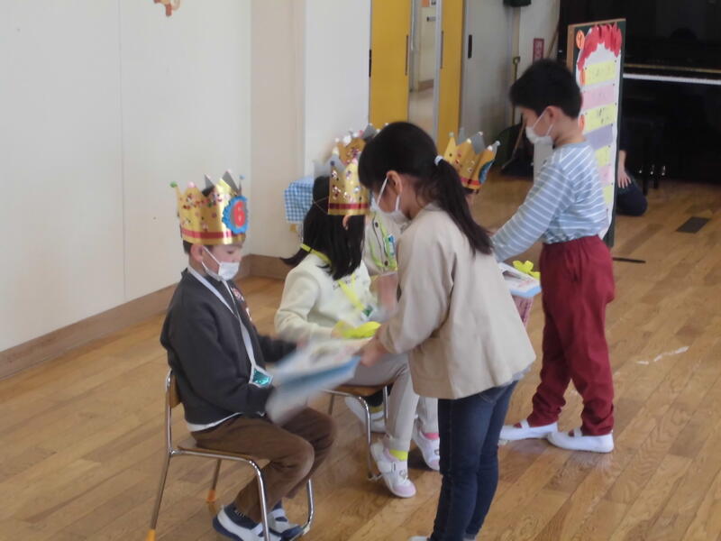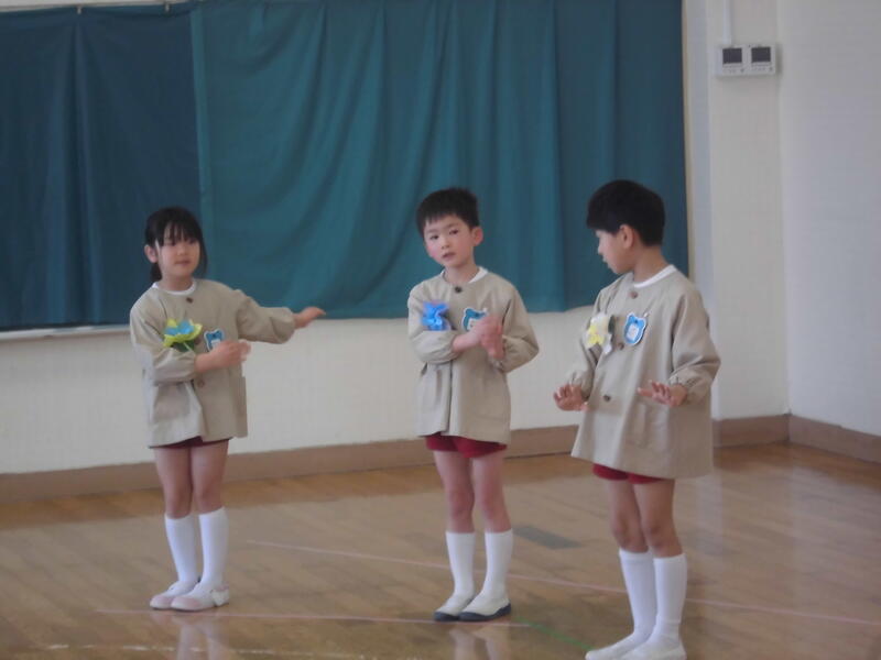 まず、「引継ぎ」として年長さんから「掃除の仕方」「マルチパネの使い方」の説明がありました。そして、「幼稚園生活の思い出」と題してインタビューを行いました。その後、年少さん年長さんお互いにプレゼントを交換しました。「お楽しみ」では、年少さんが「お買い物の劇」を披露し、みんなで「ラウンドチェーン」「チェケマッチョ」を踊りました