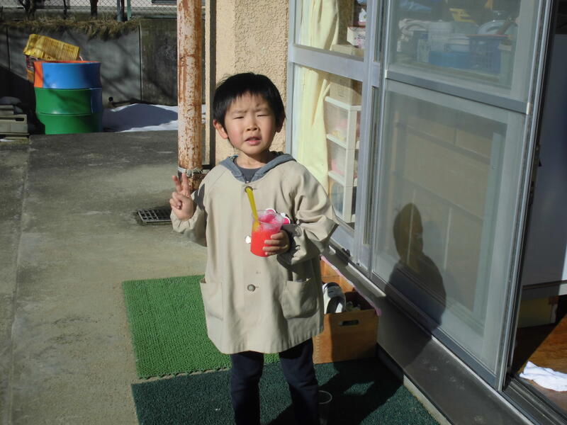 年少さんの皆さんはかき氷作りに夢中です。園庭の雪をカップに入れ、絵の具でできた色とりどりのシロップをかけて出来上がり。食べることはできませんが、出来栄えに満足そうな皆さんでした。