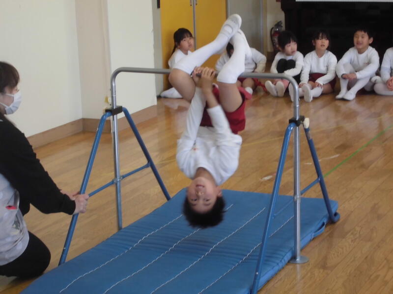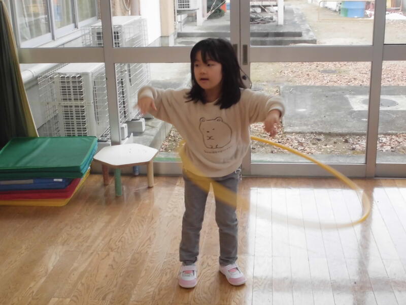 毎朝園児たちが様々な運動に挑戦しています。それぞれがどの種目(鉄棒、縄跳び、フラフープなど)に挑戦するかをホワイトボードに示しており、自分が挑戦したい新たな技や回数の自己記録更新を目指して頑張っています。
