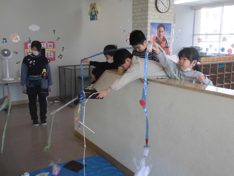 年長さんは新聞紙を丸めた竿にひもをつけて釣り竿にし、自分たちでデザインした魚を先端に取り付けた磁石で釣り上げて楽しんでいます。