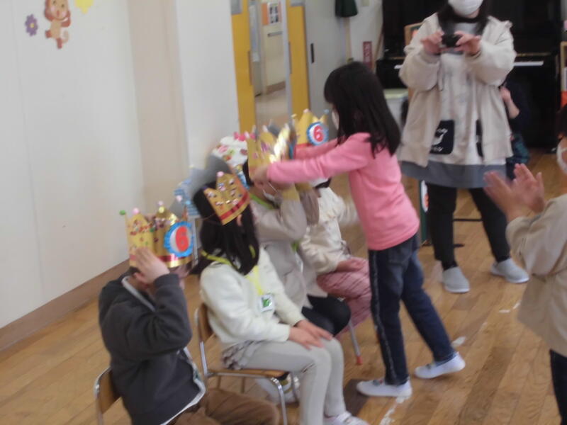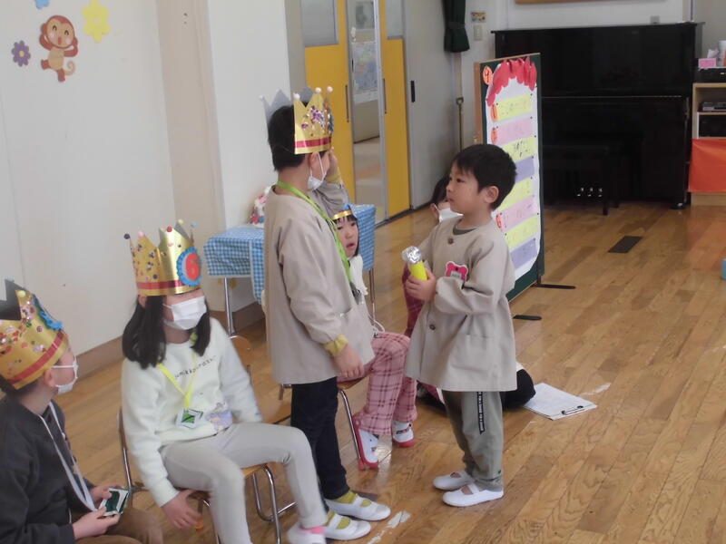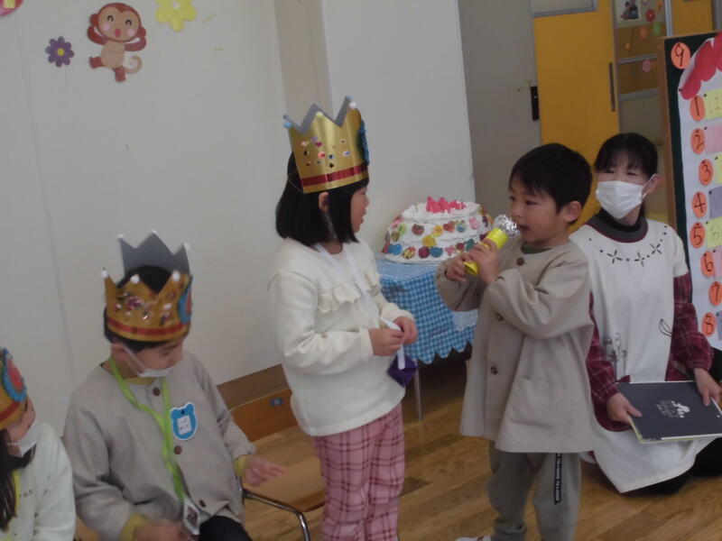 今日は2,3月生まれのお友達のお誕生会でした。会の進行は、年少組の皆さんが初めて行いましたが、とても堂々としていました。