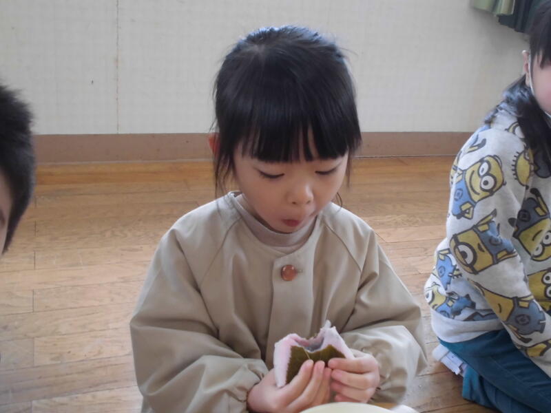 みんなで「うれしいひなまつり」を元気に歌って会が始まりました。その後、ひなまつりの始まりに関する紙芝居を鑑賞し、年長クラスの代表が、ひな人形作りで工夫したことを発表しました。お楽しみは「いちごみるく」のひなまつりバージョン。「お内裏様」「お雛様」「ぼんぼり」「ひしもち」チームに分かれてゲームを楽しみました。最後に桜餅とあられをおいしくいただきました。