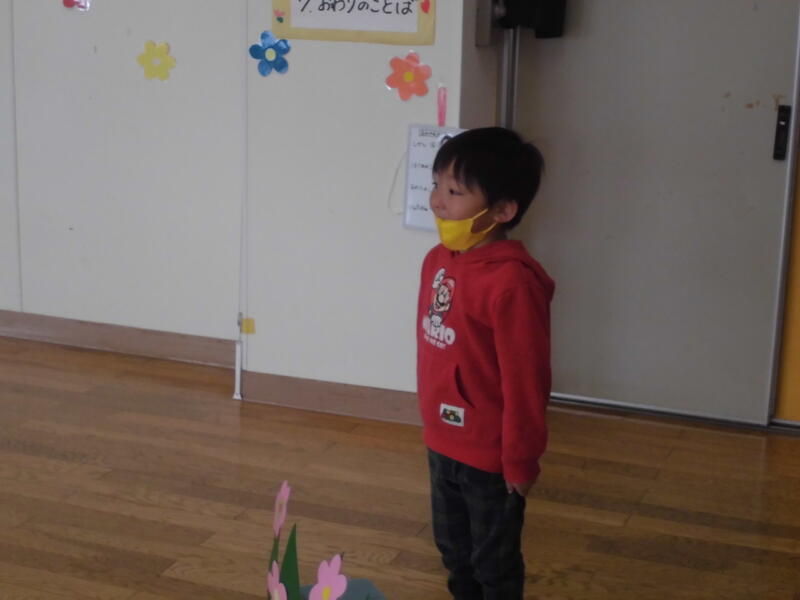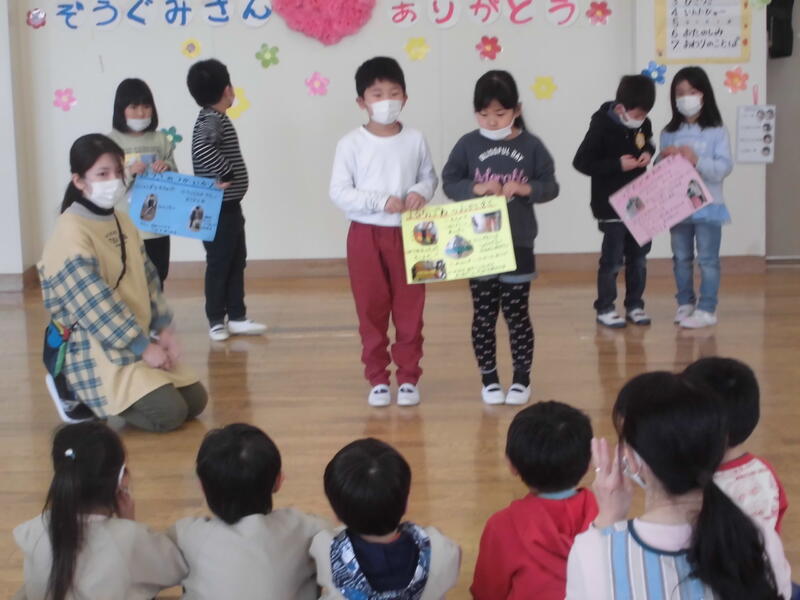 今日は「お別れれ会」がありました。この会は、年少さんがプレゼントや内容を考え、司会や進行を分担して行いました。