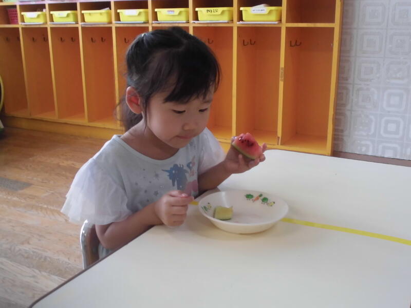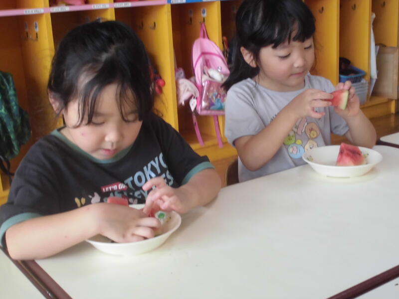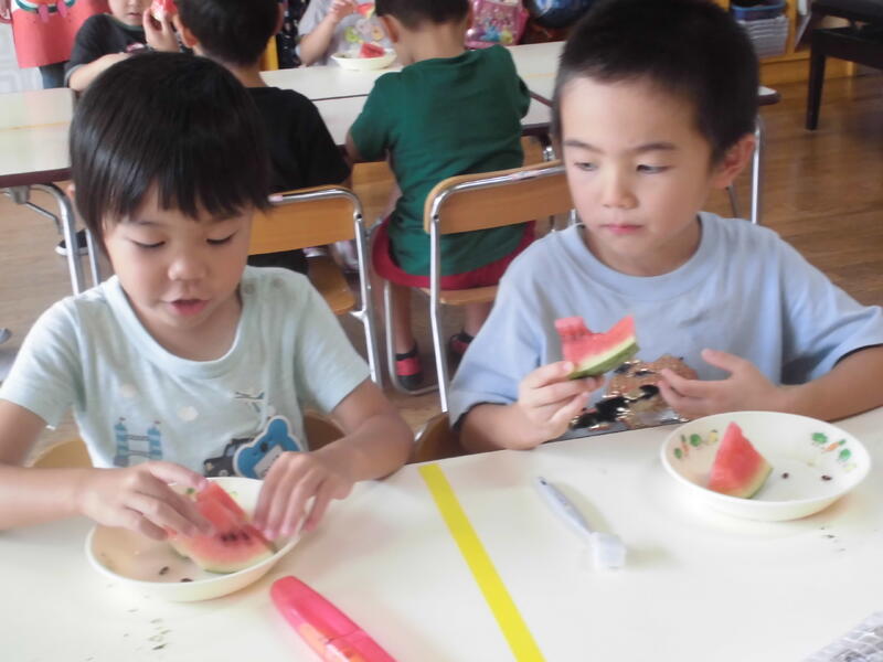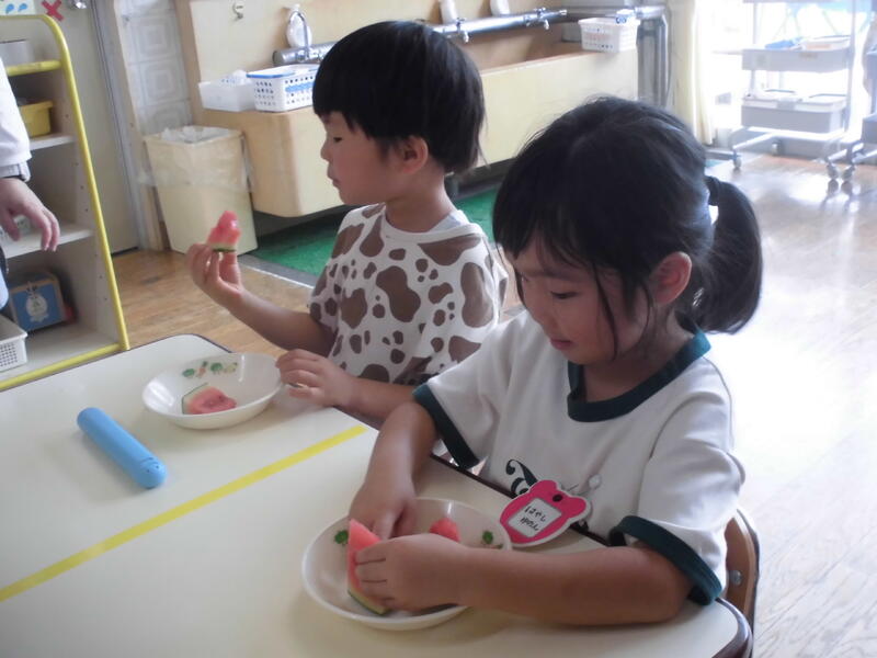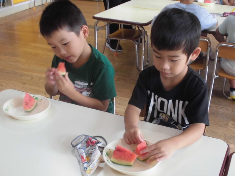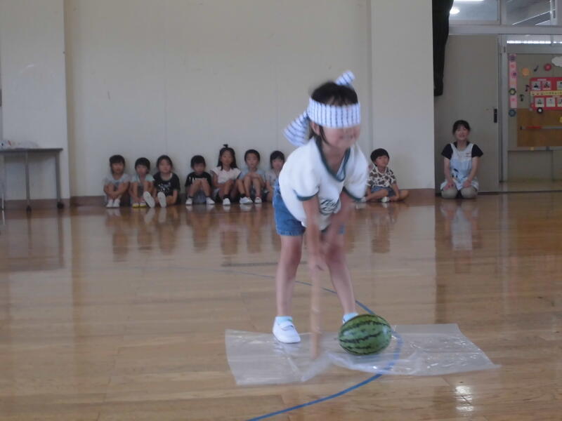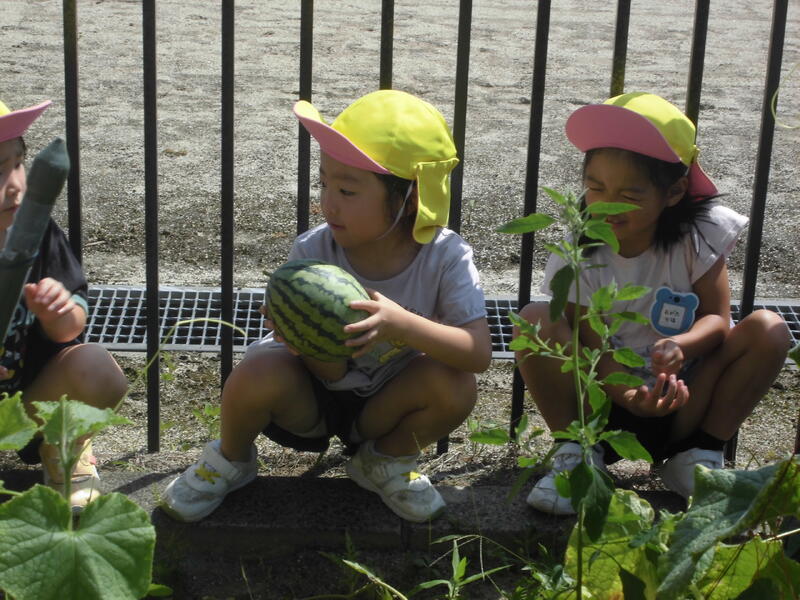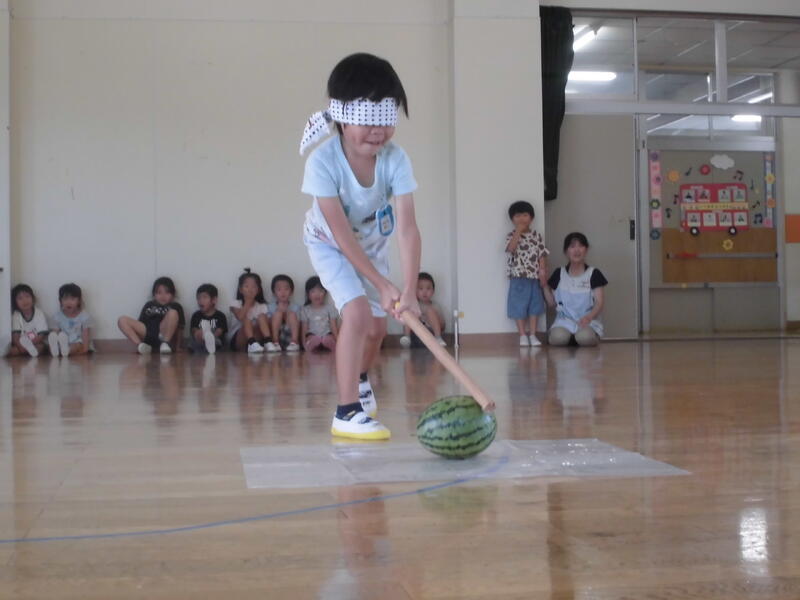 スイカ収穫→スイカ割り→おいしくいただきました 2024年9月6日 12時54分 畑のスイカがやっと大きくなり、今日収穫しました。その後全員でスイカ割りに挑戦しました。「前、前、右、左、まだまだ、そこだ」と声をかけて応援しました。昼食後にみんなで育てたスイカをおいしくいただきました。