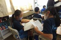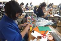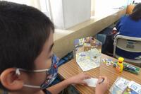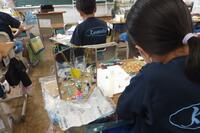 家庭科室の隣の5年1組教室では、図工の作品作りの真っただ中でした。「ミラクルミラーステージ」という題材の工作で、背景が鏡になっていることで、紙粘土や発泡スチロールなどで作った作品の後ろまでも鑑賞することができる作品でした。鏡に映ることを意識して作ることで、素敵な作品に仕上がっていました。