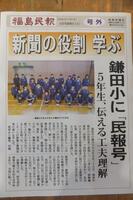 10月26日(火)。5年生で「民報出前教室」を行いました。福島民報社の地域づくり局新聞講座委員の方が講師になってくださり、情報収集の手段の一つとしての新聞の特徴やよさ、新聞記事の読み方、新聞が各家庭に届くまでの工程などを教えていただきました。また、後半には東京オリンピックの出場が決定した時の池江さんの記事をもとに、見出しを考えるという学習をしました。記事の中から印象に残った言葉を見つけ、それを組み合わせて見出しにしました。子どもたちは記事の中から、印象的な言葉を見つけ、素敵な見出しをいくつも完成させました。講師の方からも、たくさんお褒めの言葉をいただきました。今回の学習で学んだことが、子どもたちの新聞への興味・関心をさらに高めたり、新聞記事を自主学習等に生かしたりしていけるようになってくれるといいなと思っています。