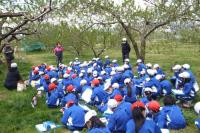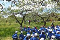 2021年4月26日 17時13分4月26日(月)。先日お話しいただいた古山さんの果樹園に行き、花粉交配などの体験をさせていただきました。今年は気温の上昇が早くて、例年よりも花粉交配の時期が早かったそうです。子どもたちのためにわざわざ残しておいてくださったリンゴの木で花粉交配をしました。まずは、実際のリンゴの木で花の観察を行いました。そのあと花粉交配の仕方について説明していただき、実際にやってみました。子どもたちも本物のリンゴの木や果樹畑を見ると、いろいろな発見があったようです。