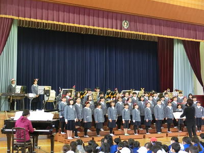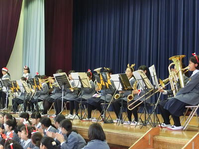 18日(水)お昼休みに、体育館で、合唱部と合奏部のクリスマスコンサートが行われました。昨年は音楽室で行ったところ、入りきれないほどの子どもたちが集まってくれたので、今回は、体育館で行うことにしました。今年もたくさんの子どもたちや先生方が集まりました。