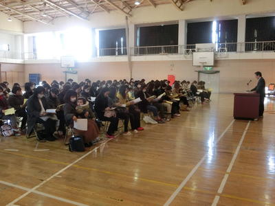 2月18日(月)午後3時から、新1年生保護者説明会が行われました。校長あいさつから、入学前の心得、安全な登下校、保健関係、PTA活動、就学援助・諸費等、各係から様々な説明がありました。4月8日(月)が入学式です。新1年生の皆さん、入学する日を楽しみに待ってますよ。