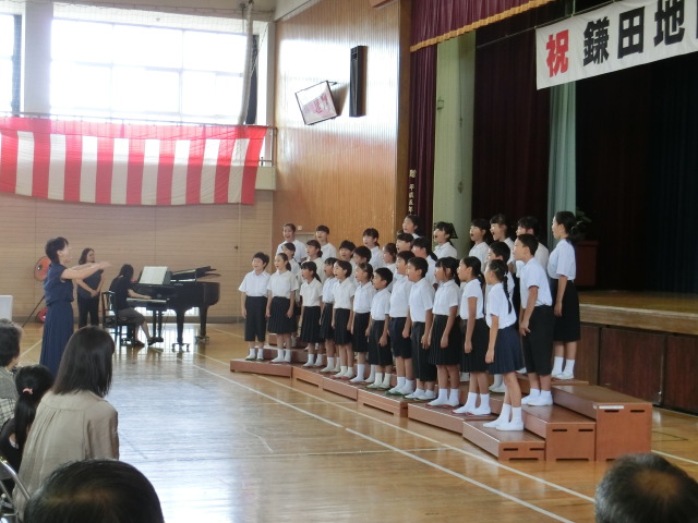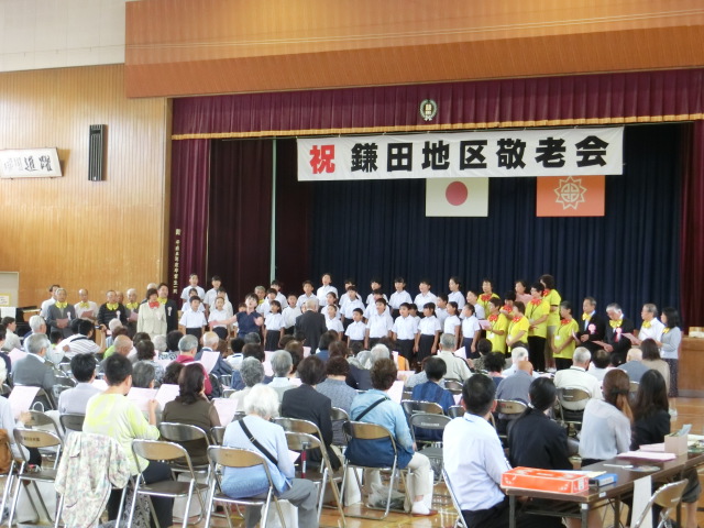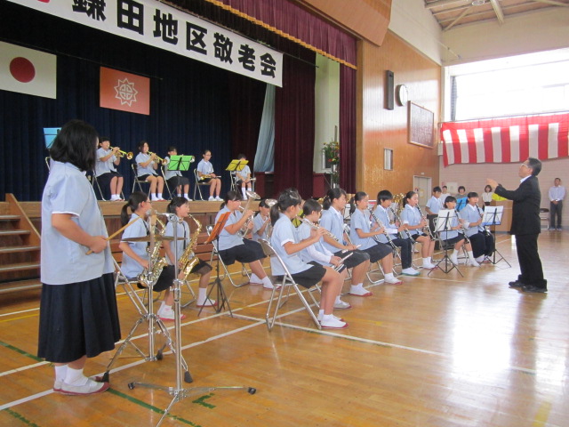 2018年9月3日 08時32分9月2日(日)に鎌田小学校体育館で、鎌田地区敬老会が行われました。特設合奏部、合唱部の皆さんは、毎年この場で演奏を披露します。10時から式典が始まり、終了後、いよいよアトラクションとして子どもたちの出番です。1番目に、特設合奏部が「A WHOLE NEW WORLD」を演奏しました。特設合唱部は最後の4番目に登場です。県大会で歌った「出発」「シーラカンスをとりに行こう」の2曲を披露しました。会場からは温かな拍手が送られました。また、最後に全員で「ふるさと」を合唱し、今年の敬老会を終えることができました。