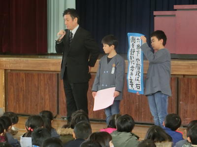 三つ目です。運動、音楽、芸術いろいろな分野で活躍する子どもたちがたくさんいることです。本日は、「第7回小学校復興ポスター展優良賞及び福島の子どもたちの絵画展ニューヨーク特別賞」を受賞した6年3組鈴木さくらさんの表彰を行いました。