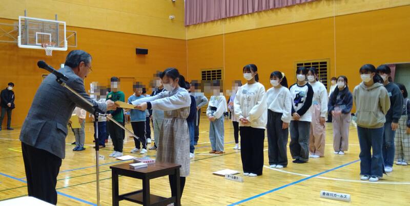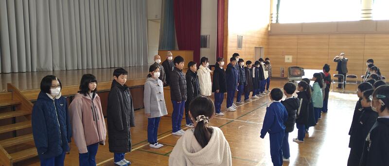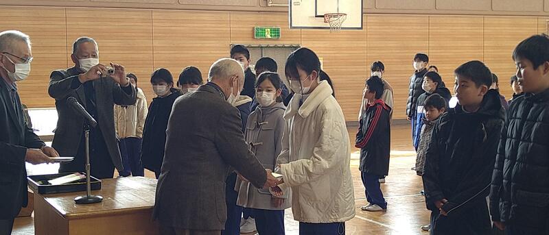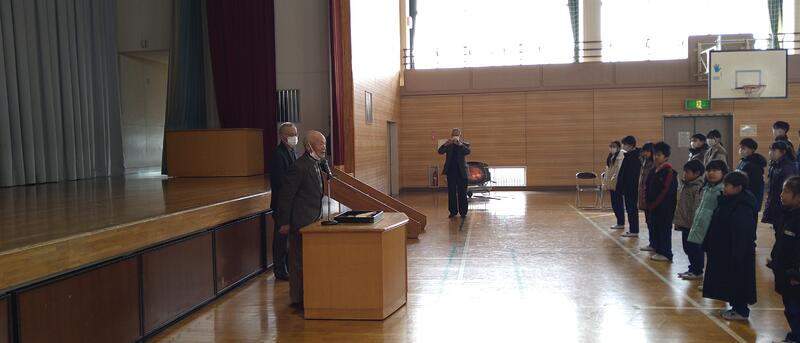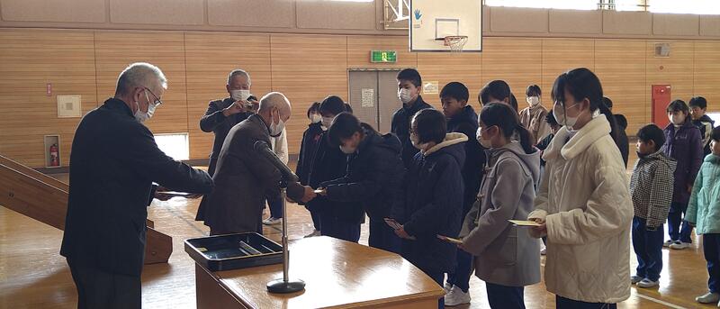 雪の降る中、金谷川小学校の子供達のためにと来校され、最優秀賞を受賞した子供たち一人一人に授与していただきました。また、今年で最後になるということで、子供たち全員と教職員にも参加賞をいただきました。ありがとうございました。大切に使わせていただきます。