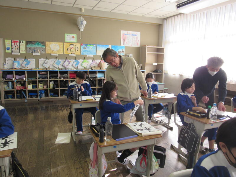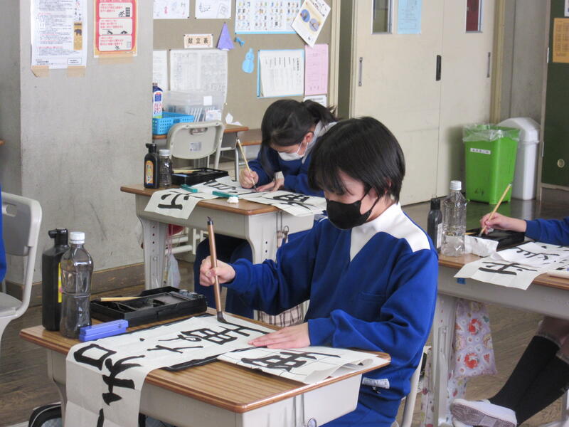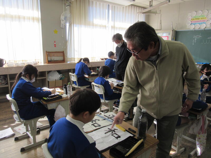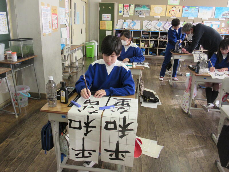 今日は、5年生の書初め教室を行いました。講師の先生は、まつかわ幼稚園長 遠藤 嘉人 様です。5年生が園長先生に教えていただくもの、今年で3回目になります。