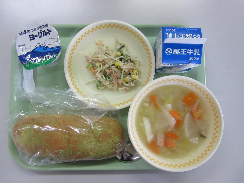 今日の給食は、特別メニューです。なんと、「きなこ揚げパン」の登場です。