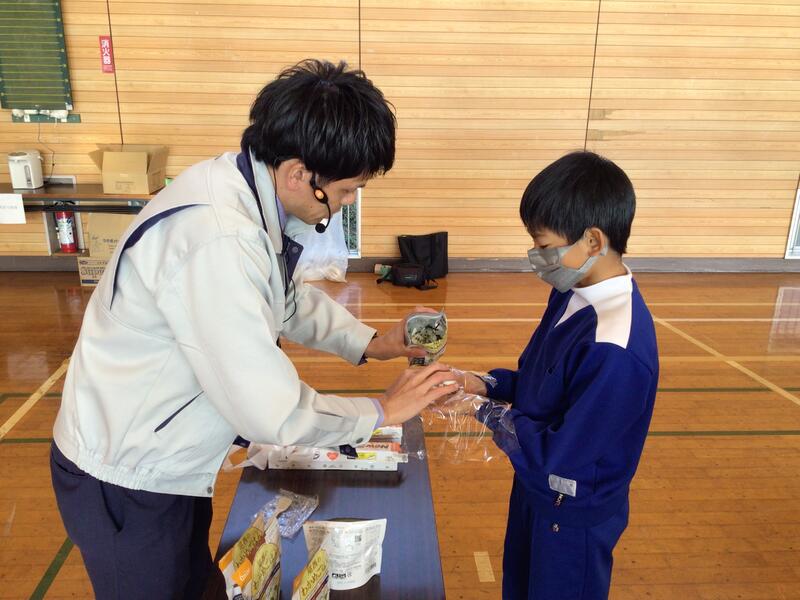 避難する時に大切なことについて教えていただいた後、アルファ米を使ったおにぎりを試食させていただきました。