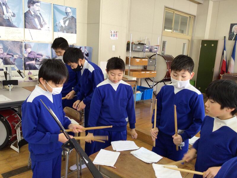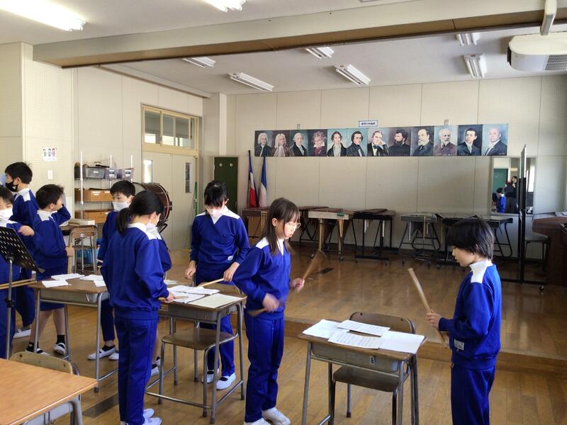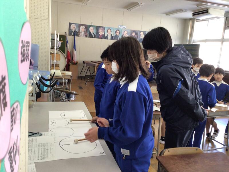 担当教員指導のもと、パート毎に6年生が丁寧に教えていました。来年3月の鼓笛移杖式に向けて、子供たちは頑張っています。