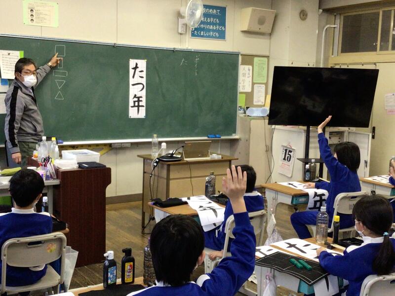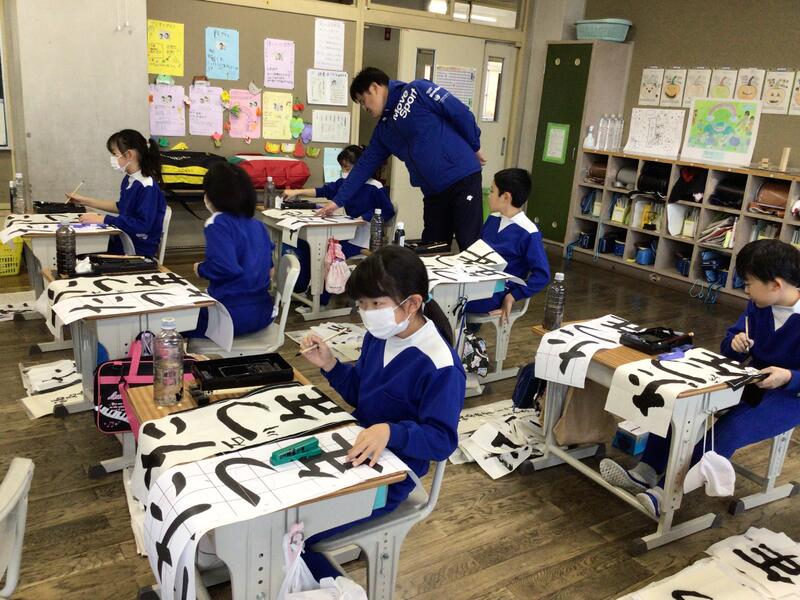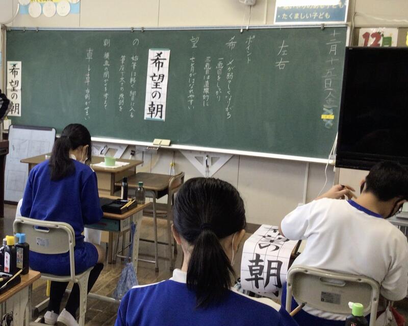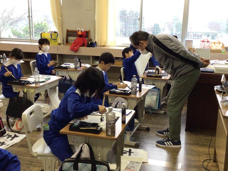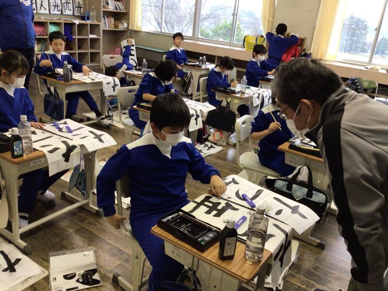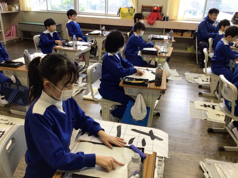 4年生に引き続き、3・6年生でも書き初めの練習を行いました。講師は、まつかわ幼稚園長の遠藤嘉人先生です。