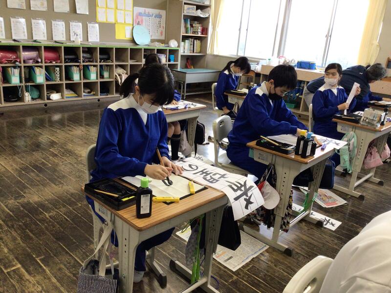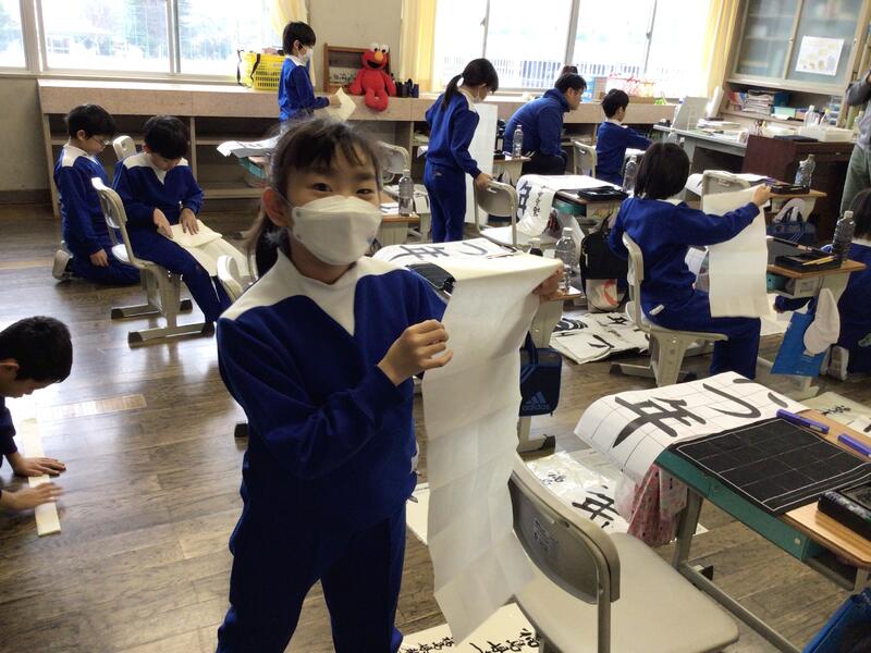 3年生にとって、初めての条幅紙での書き初めです。文字の形に気を付けながら、一筆毎に丁寧に書きます。