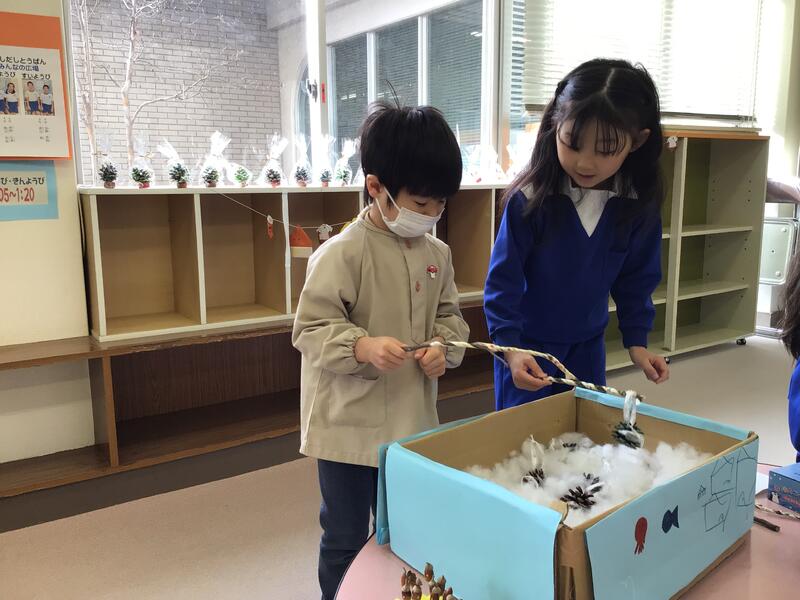 白い雪の中から、お目当ての松ぼっくりを上手に釣れるかな?