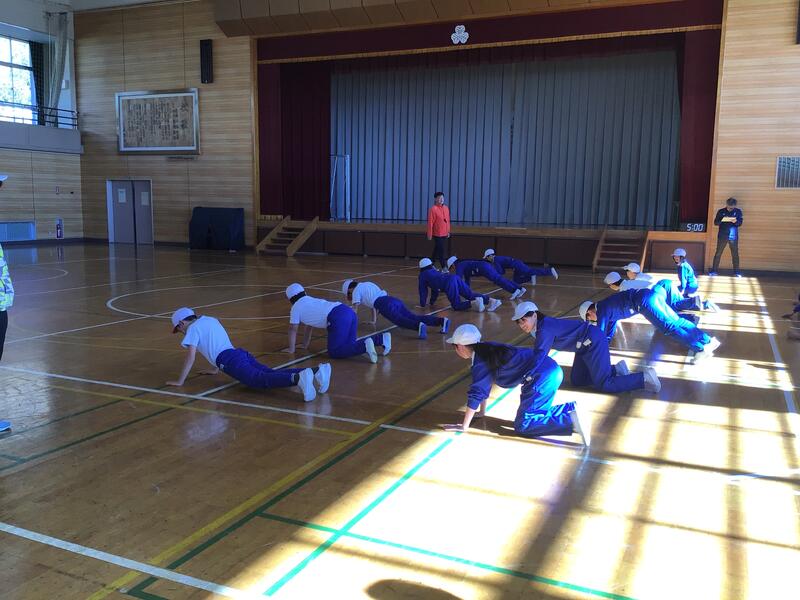 まずは、しっかり準備運動。マット運動に適した運動身体作りプログラムで、支持、接点、倒立感覚を養っていました。