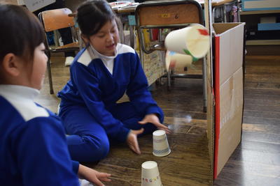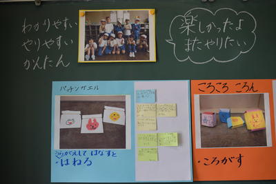 この生活科の授業は、明日27日の5校時に、福島大学の大学生と教授が参観します。2年生は1年生に楽しんでもらう工夫として、「パワーアップ」(「よりよく」が生活科のキーワード)作戦を展開する予定??だと思います。また、このおもちゃランドには、今後、まつかわ幼稚園やあいあい保育園も招待するものと思います。たのしみ~