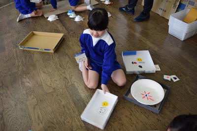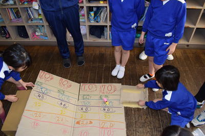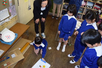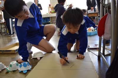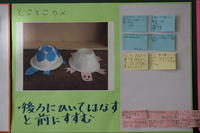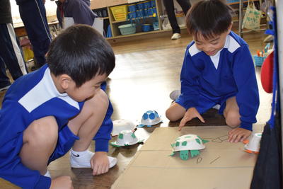 ゴム動力のカメが、コースアウトになったとき、先生が「これでは0点?」とたずねると、「いいえ、10点です」と担当の子どもが。そして→「何で0点ではなく、10点?」→「せっかくやって、0点では、かわいそうだから」(ここで、その意味を知らない子ども達が「気づき」を得ます。)