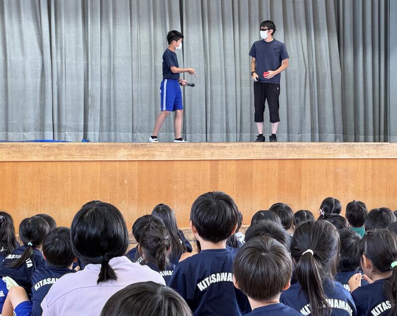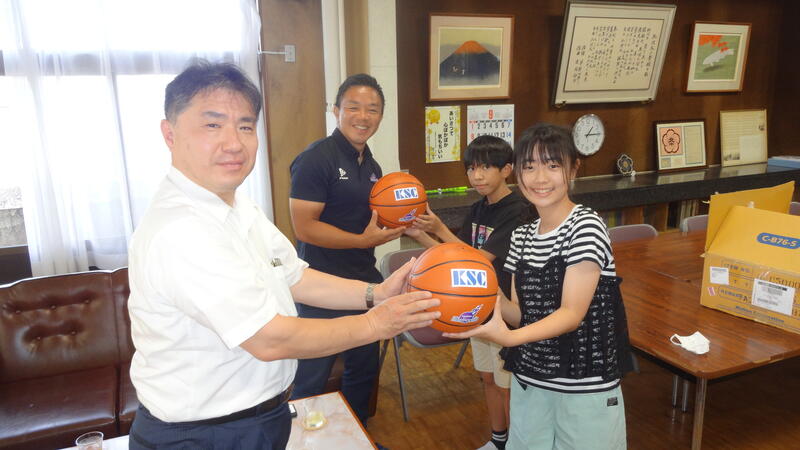 株式会社KSC代表取締役社長の佐藤勝也様と福島Firebondsを運営する福島スポーツエンタテインメント株式会社代表取締役社長の西田創様が来校し、本校の代表児童2名にボールを手渡し、「授業や休み時間にどんどんボールを使って、もっともっと運動が好きになってもらいたい」とのメッセージもいただきました。