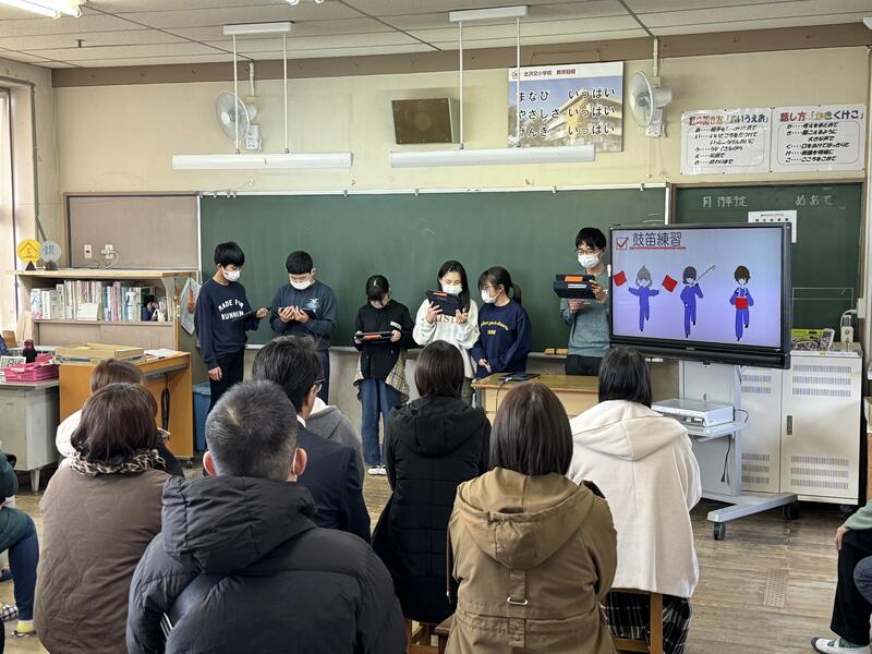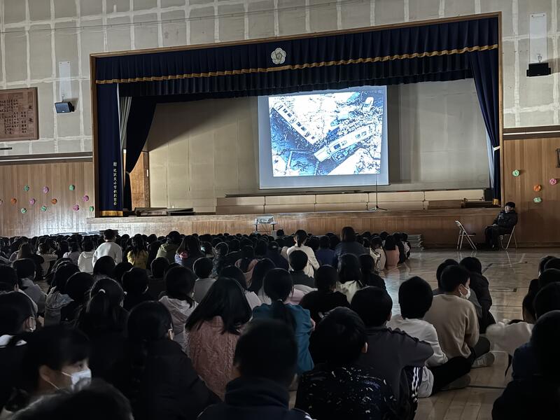 次に、校長先生から全校生に以下のようなお話がありました。「 今日の全校集会には3つの目的があります。13年前の3月11日に何があったのかを知るため、震災で天国へ行った方へお祈りをするため、そして、震災の教訓を生かしていくためです。今日は何もしゃべらないで自分の心の中で考えましょう。」その後、震災に関するたくさんの画像がスクリーンに映され、子どもたちはそれらを食い入るように見ていました。「 なぜやさしさは大切なのですか。あなたはどう思いますか。」