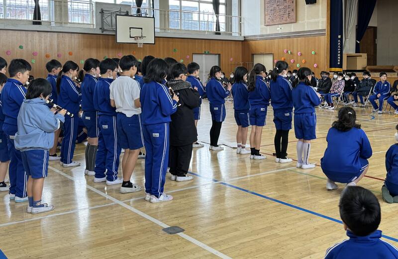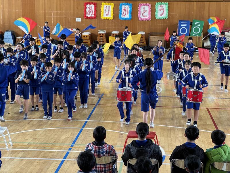 在校生のみんなで作ったメッセージ入りの金メダルを、5年生が代表して6年生の首にかけました。また、鼓笛移杖式の後、鼓笛演奏による校歌を披露しました。