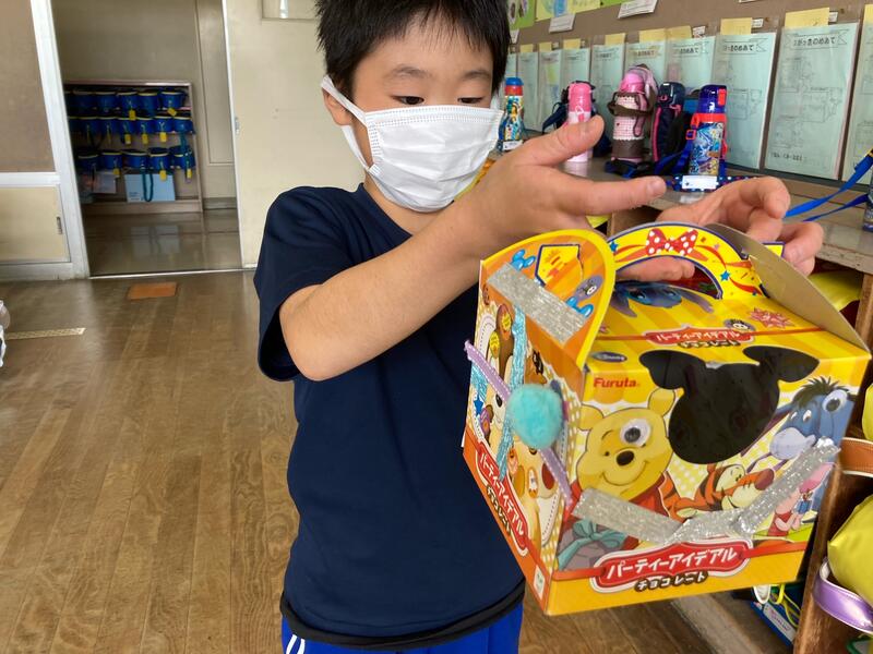 持ってきた箱や紙袋に思い思いに飾り付けをして素敵な宝箱を作ることができました。