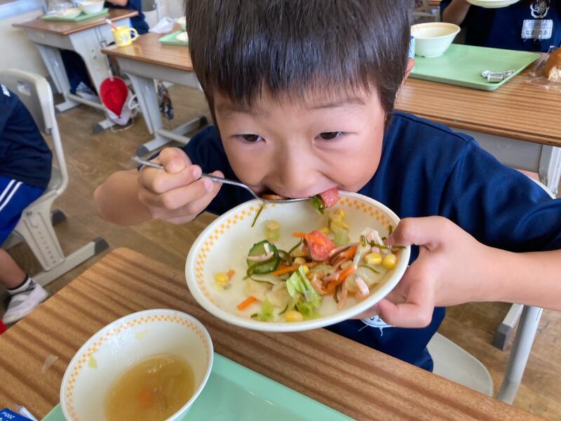 1年生は国語科で『サラダでげんき』を学習したばかりだったので、興味津々で給食を食べました。