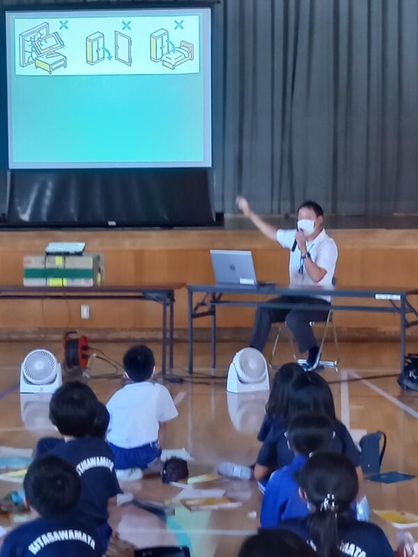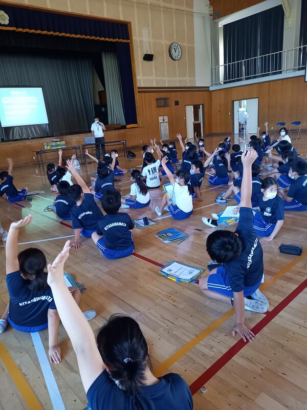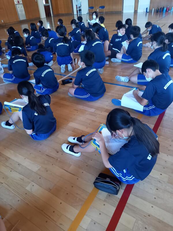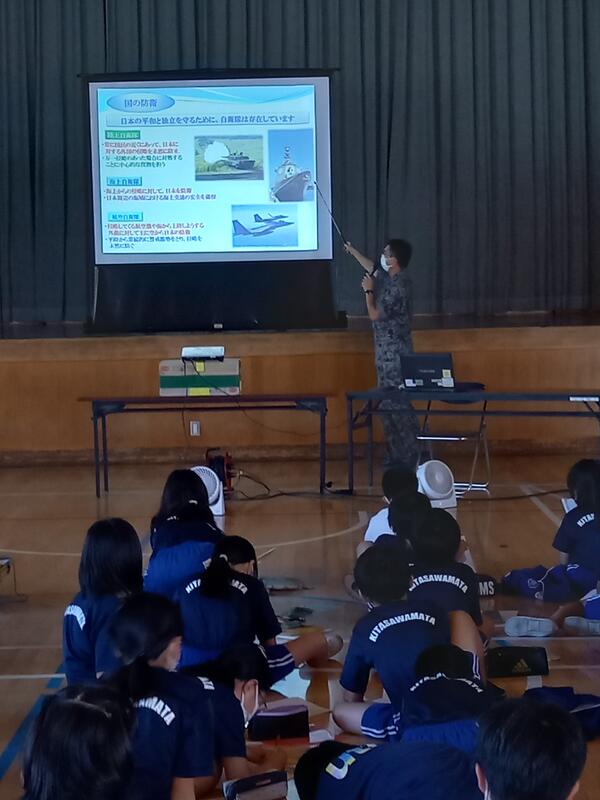 9月14日3校時に体育館で、防災教室が行われました。自衛隊と市役所の方々を講師にお迎えして、防災対策の現状や日頃の災害に対する備えなどをわかりやすく教えていただきました。