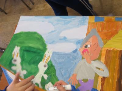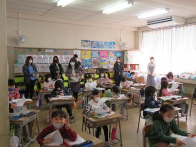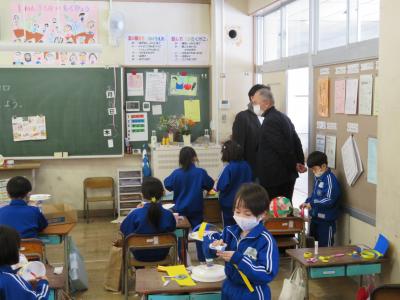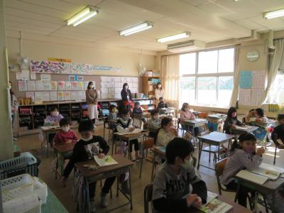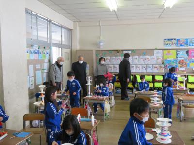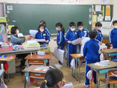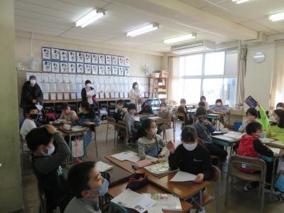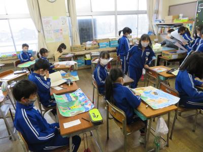 3年生の様子です。図工と理科でした。図工は、描いた絵の説明を書いて作品に貼っていました。力作ぞろいでした。理科はものの重さの学習で、はかりを使って、いろいろなものの重さを測って比べていました。