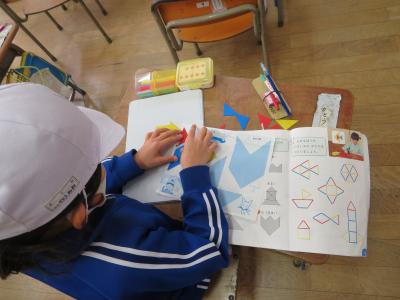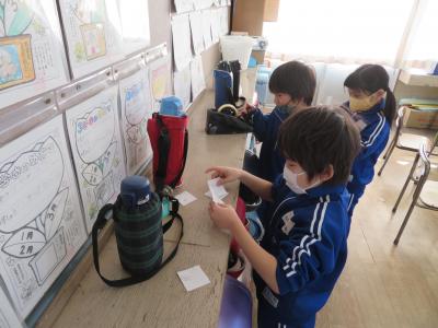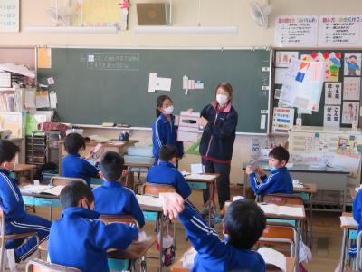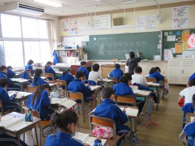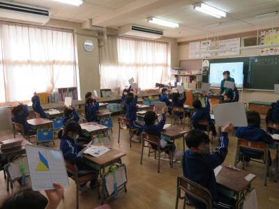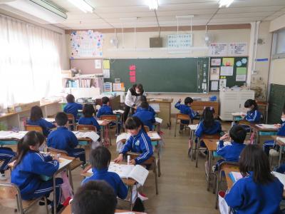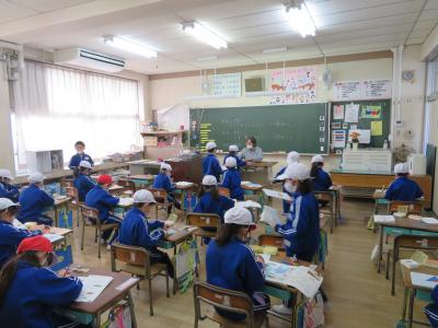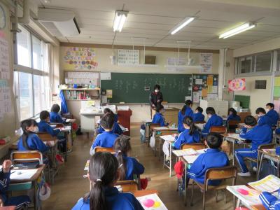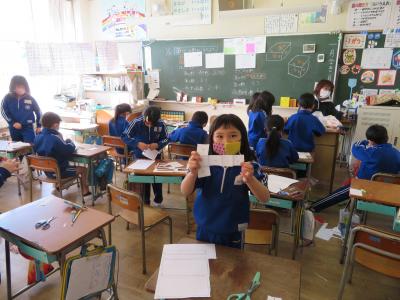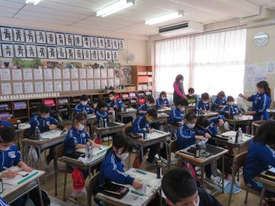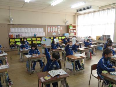 2年生の様子です。3学級ともに、算数の学習で「はこの形をしらべよう」の内容でした。色画用紙を使ったり、実際の箱を使ったりして、「はこ」の特徴を捉えていました。「展開図」の学習内容に気付いた児童も見られました。すごいでね。