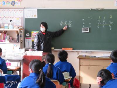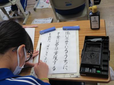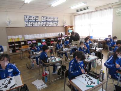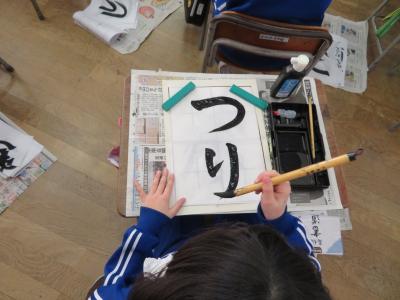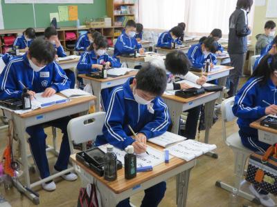 教頭先生の毛筆の学習でした。「曲げる」のは、つい筆を回してしまうので、なかなか難しいのですが、しっかりと気を着けて書いていました。