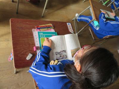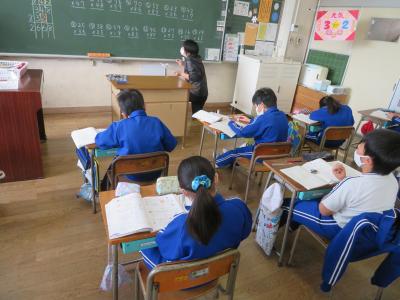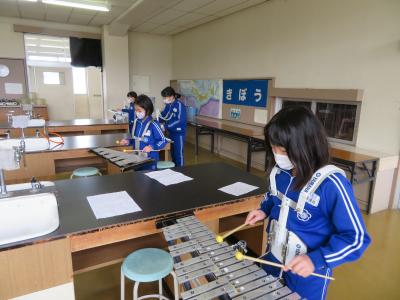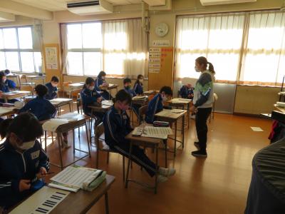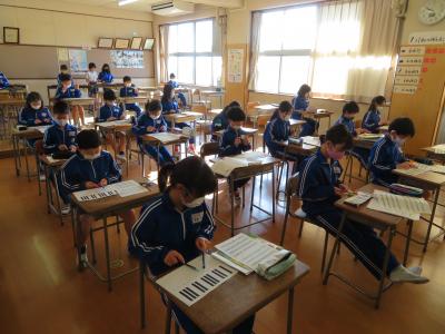 4年生の様子です。音楽室で木琴の演奏の学習でした。児童数分の楽器がないので交代で木琴をたたき、順番ではない児童は印刷された用紙を使って練習をしていました。