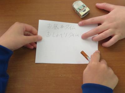 学級活動でした。お楽しみ会でどのようなことをしたいのか、自分の考えを紙に書いているところでした。ん?お昼寝タイム・・・。