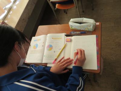 同様に算数のグラフの学習でした。帯グラフと円グラフにまとめているところでした。