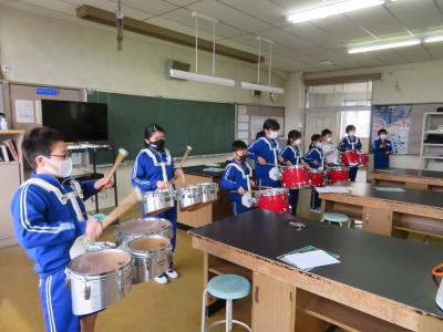 5年生の鼓笛の練習の様子です。感染防止対策を行って練習に取り組んでいます。パートごとに6年生に教えてもらいながら、頑張っています。伝統の引継ぎです。