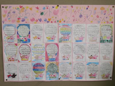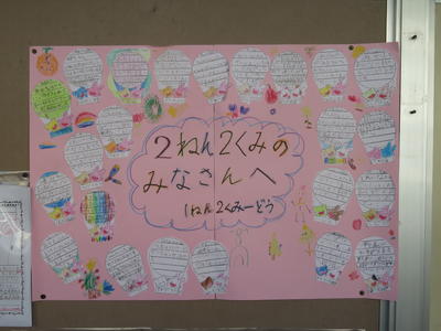 先週、2年生が招待してくれたおもちゃ祭りへの1年生からのお礼の手紙を掲載しましたが、2年生の他の学級への手紙も学級内に掲示されていました。1年生一人一人の楽しかった気持ちやありがとうの気持ちがたくさん詰まっていました。寒い日ですが、心がほっこりしました。