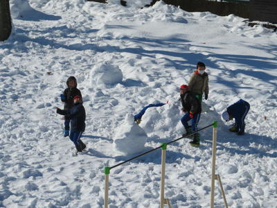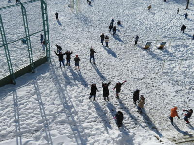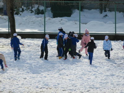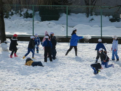 先生も一緒に雪遊びをしていました。でも途中からなんか様子が変です。あれ?みんなから雪玉を当てられている?
