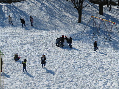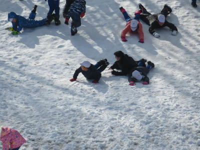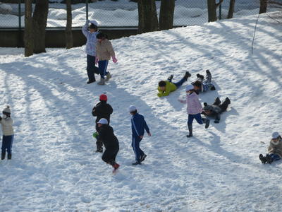 太陽が出ていたので、校庭では雪遊びに夢中になっている児童の様子が見られました。山に雪が積もったら何をするか・・・そんなの簡単。「滑る」に決まっていますよね。楽しそうに滑っていました。いけ~~~~。