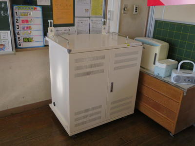 タブレットの使用に向けた工事が進んでいます。教室に学級全員のタブレットを収納する「キャビネット」が準備されました。来年4月からは本格的に一人一台ずつ使用するようになります。児童は覚えるのが早いので、教職員も負けないように頑張ります。